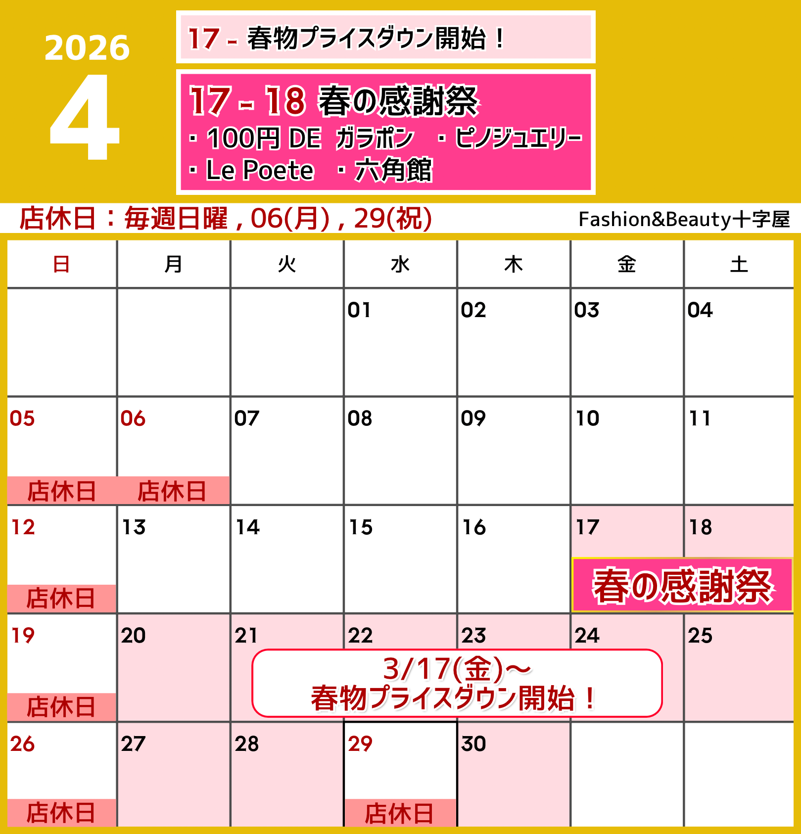 4/6(月) 、 29(祝)は休業いたします。